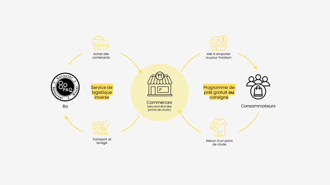 Bo offre des contenants réutilisables que vos clients peuvent acheter avec consigne en achetant un plat prêt-à-manger à votre commerce. Une fois qu'il a savouré son repas, il peut revenir à vous pour récuperer sa consigne ou utiliser l'appli Bo pour rembourser sa consigne en toute autonomie.
