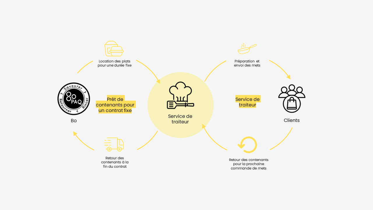 Avec Bo, commandez facilement la location de plats réutilisables pour vos services de traiteur avec l'option de personaliser vos plats avec votre marque. À la fin du contrat, Bo s'occupera du lavage des plats une fois que vous récupérez les plats de votre client.