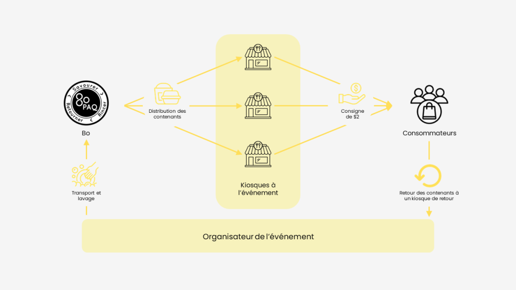 .Bo offre des contenants réutilisables pour des événements de toutes tailles. En plus de la location des contenants de différents formats, il y a aussi possibilité d’y ajouter votre marque! Bo offre aussi des services d’accompagnement, de collection et de lavage pour vous aider à organiser un événement sans déchets tout en aisance.